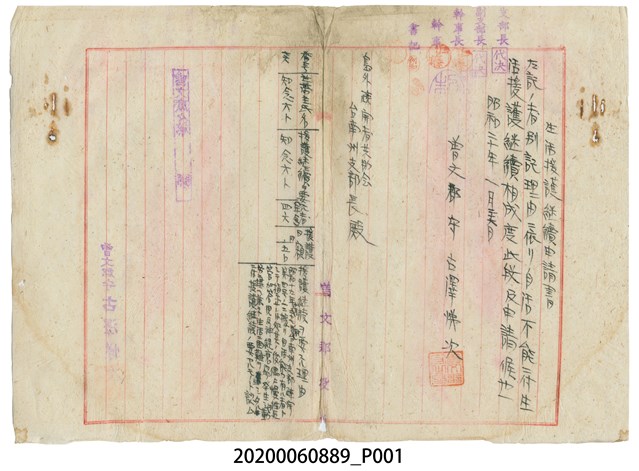 1945年1月26日曾文郡守寄臺南州支部長生活援護繼續申請書