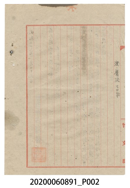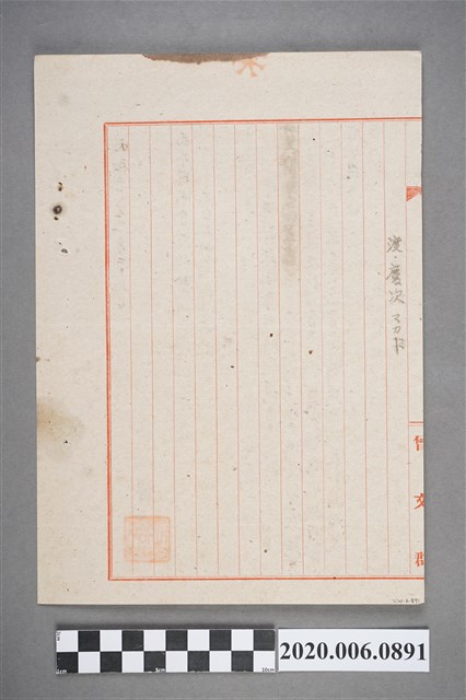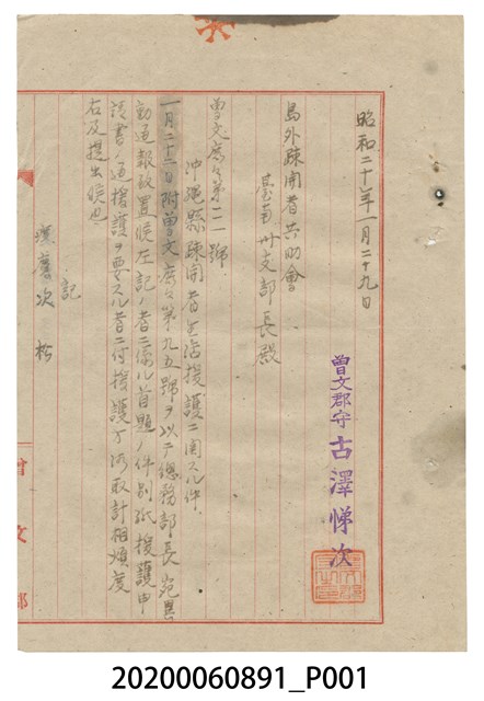 1.本件長18.4公分、寬26.2公分、高0.1公分。文件為曾文郡守古澤悌次給島外疏開者共助會臺南支部長的公文,主旨為沖繩縣疏開者生活援護相關之件,主要是針對申請人的島外疏開民生活援護申請書進行調查,以確認其真實性。 2.疏開是指日本政府有計畫下將人口密集的臺北、基隆、高雄等地的居民疏散至山邊或鄉下,以減少人民受空襲轟炸的死傷。二戰末期,美國在太平洋戰爭採取跳島戰術,佔領菲律賓、攻佔沖繩島,對臺灣指轟炸不佔領。1944年日本政府宣布「疏開綱要」,美軍亦開始空襲臺北至高雄等重要城市,1945年對高雄進行大轟炸。本件即是此背景下產生,原居住於於沖繩縣的島民被疏開至臺灣臺南東門一帶,並經過申請後,其生活費由日本政府負擔。