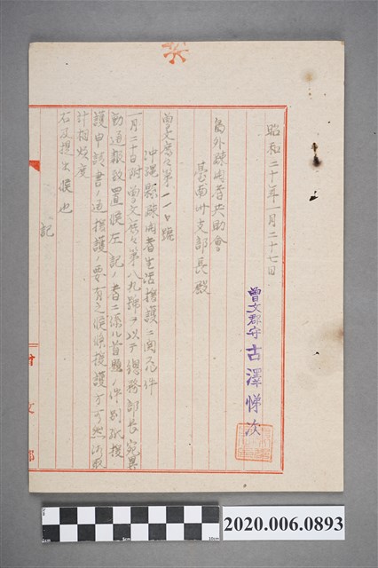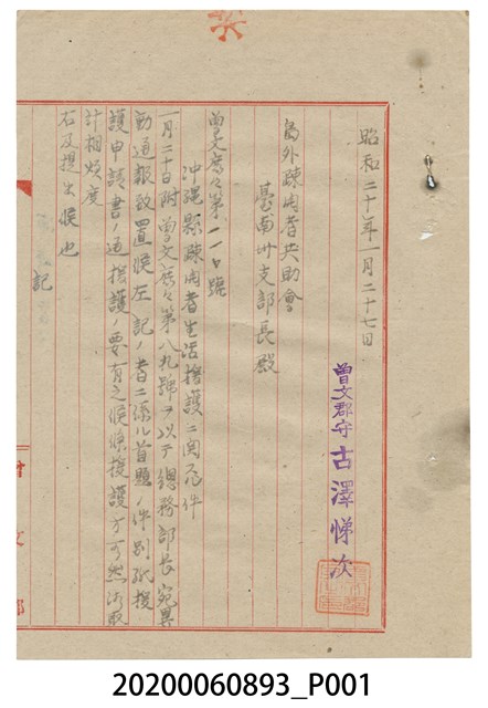 2020.006.0893 1945年1月27日曾文郡守寄臺南州支部長信件