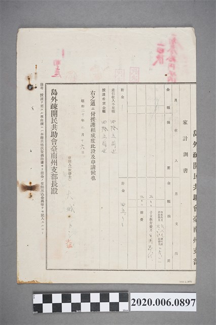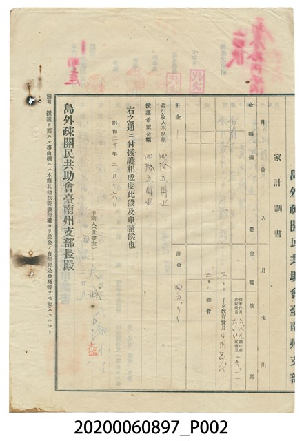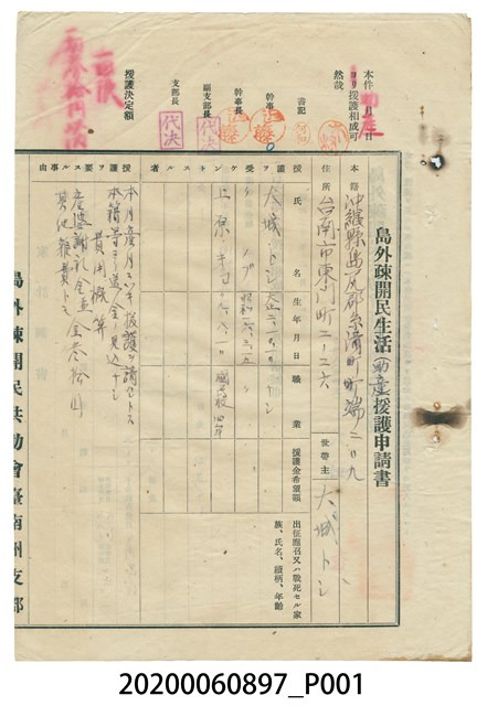1.本件長18.4公分、寬26.2公分、高0.1公分。文件為申請人大城トシ的島外疏開民申請書,表上需填寫本籍、現居所、申請人出生年月日、職業、申請援助的原因、希望的援助金額,以及家中是否有應召出征或戰死的家族親人等資訊。2.疏開是指日本政府有計畫下將人口密集的臺北、基隆、高雄等地的居民疏散至山邊或鄉下,以減少人民受空襲轟炸的死傷。二戰末期,美國在太平洋戰爭採取跳島戰術,佔領菲律賓、攻佔沖繩島,對臺灣指轟炸不佔領。1944年日本政府宣布「疏開綱要」,美軍亦開始空襲臺北至高雄等重要城市,1945年對高雄進行大轟炸。本件即是此背景下產生,原居住於於沖繩縣的島民被疏開至臺灣臺南東門一帶,並經過申請後,其生活費由日本政府負擔。