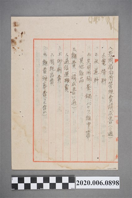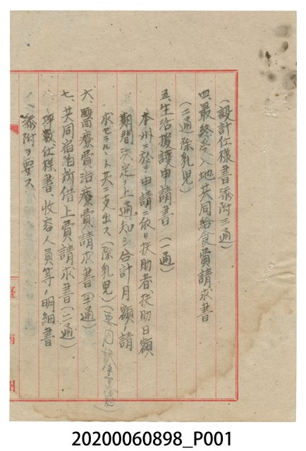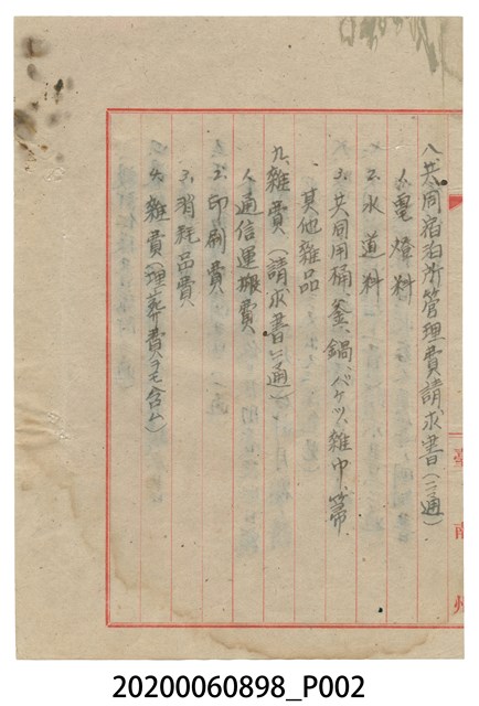 1.島外疏開生活援護申請書及各式費用項目紀錄。2.疏開是指日本政府有計畫下將人口密集的臺北、基隆、高雄等地的居民疏散至山邊或鄉下,以減少人民受空襲轟炸的死傷。二戰末期,美國在太平洋戰爭採取跳島戰術,佔領菲律賓、攻佔沖繩島,對臺灣指轟炸不佔領。1944年日本政府宣布「疏開綱要」,美軍亦開始空襲臺北至高雄等重要城市,1945年對高雄進行大轟炸。本件即是此背景下產生,原居住於於沖繩縣的島民被疏開至臺灣臺南東門一帶,並經過申請後,其生活費由日本政府負擔。