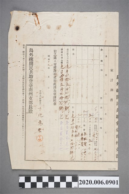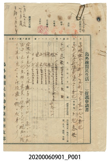 1.本件長18.4公分、寬26.2公分、高0.1公分。文件為申請人下地惠察的島外疏開民申請書,表上需填寫本籍、現居所、申請人出生年月日、職業、申請援助的原因、希望的援助金額,以及家中是否有應召出征或戰死的家族親人等資訊。2.疏開是指日本政府有計畫下將人口密集的臺北、基隆、高雄等地的居民疏散至山邊或鄉下,以減少人民受空襲轟炸的死傷。二戰末期,美國在太平洋戰爭採取跳島戰術,佔領菲律賓、攻佔沖繩島,對臺灣指轟炸不佔領。1944年日本政府宣布「疏開綱要」,美軍亦開始空襲臺北至高雄等重要城市,1945年對高雄進行大轟炸。本件即是此背景下產生,原居住於於沖繩縣的島民被疏開至臺灣臺南東門一帶,並經過申請後,其生活費由日本政府負擔。