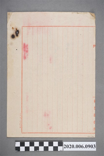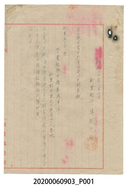 1.本件長18.4公分、寬26.2公分、高0.1公分。文件為新豐郡守給島外疏開者共助會臺南州總務部長的公文,主旨為沖繩縣疏開者生活援護相關之件,主要是針對申請人的島外疏開民生活援護申請書進行調查,以確認其真實性。 2.疏開是指日本政府有計畫下將人口密集的臺北、基隆、高雄等地的居民疏散至山邊或鄉下,以減少人民受空襲轟炸的死傷。二戰末期,美國在太平洋戰爭採取跳島戰術,佔領菲律賓、攻佔沖繩島,對臺灣指轟炸不佔領。1944年日本政府宣布「疏開綱要」,美軍亦開始空襲臺北至高雄等重要城市,1945年對高雄進行大轟炸。本件即是此背景下產生,原居住於於沖繩縣的島民被疏開至臺灣臺南東門一帶,並經過申請後,其生活費由日本政府負擔。