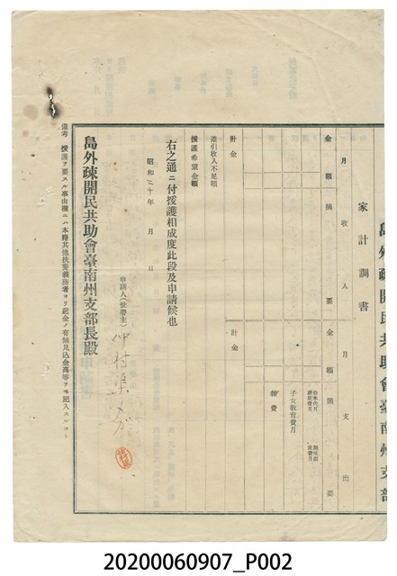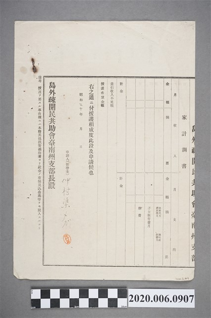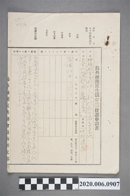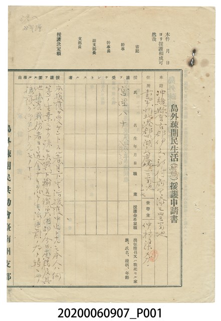 2020.006.0907 1945年仲村渠メガ島外疎開民生活援護申請書