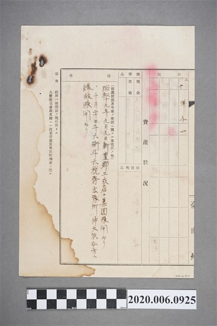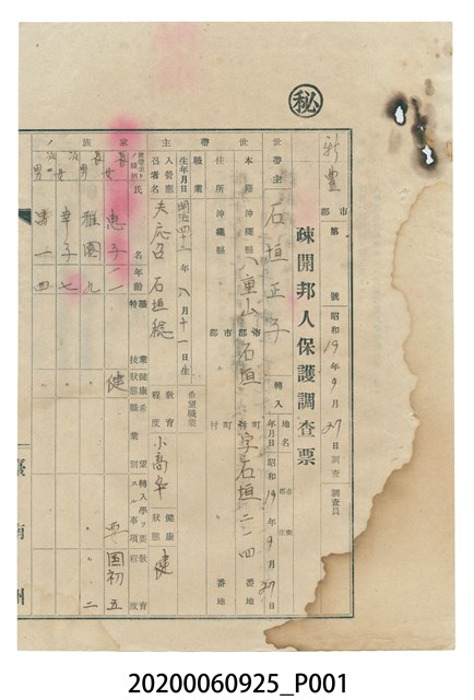 1.本件長17.7公分、寬25.5公分、高0.1公分。石垣正子的疏開邦人保護調查票,需填寫本籍、現居住所、家人資料、資產狀況等資料。2.戰時災害保護法係因應大東亞戰爭(太平洋戰爭)所頒布的法案。依敕令第629號,施行範圍涵蓋朝鮮、臺灣與樺太半島(今庫頁島南部)。臺灣方面,則依照臺灣總督府府令第136號(1942年8月19日總督長谷川清頒布)的戰時災害保護法施行規則辦理,其內容亦包含防空法相關規定、戰時設施損害、撫恤金等內容。 3.疏開是指日本政府有計畫下將人口密集的臺北、基隆、高雄等地的居民疏散至山邊或鄉下,以減少人民受空襲轟炸的死傷。二戰末期,美國在太平洋戰爭採取跳島戰術,佔領菲律賓、攻佔沖繩島,對臺灣指轟炸不佔領。1944年日本政府宣布「疏開綱要」,美軍亦開始空襲臺北至高雄等重要城市,1945年對高雄進行大轟炸。