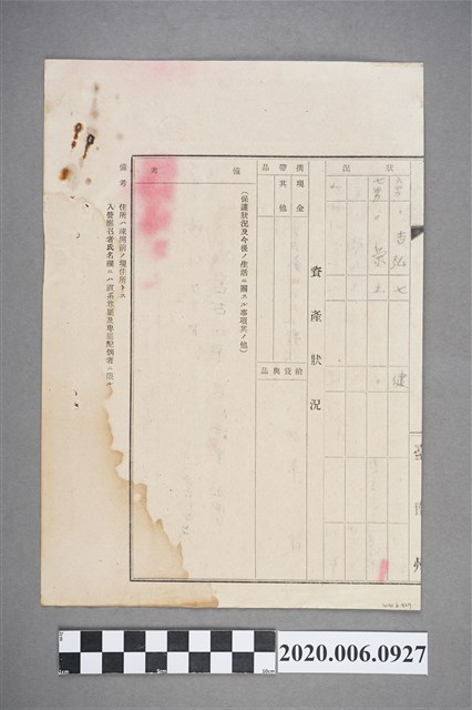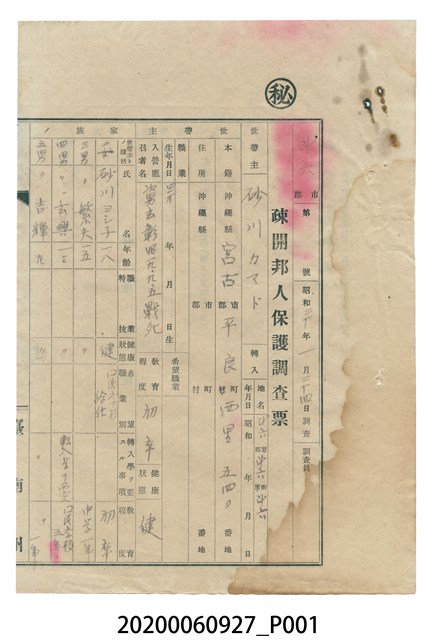 1.本件長17.7公分、寬25.5公分、高0.1公分。砂川カマド的疏開邦人保護調查票,需填寫本籍、現居住所、家人資料、資產狀況等資料。2.戰時災害保護法係因應大東亞戰爭(太平洋戰爭)所頒布的法案。依敕令第629號,施行範圍涵蓋朝鮮、臺灣與樺太半島(今庫頁島南部)。臺灣方面,則依照臺灣總督府府令第136號(1942年8月19日總督長谷川清頒布)的戰時災害保護法施行規則辦理,其內容亦包含防空法相關規定、戰時設施損害、撫恤金等內容。 3.疏開是指日本政府有計畫下將人口密集的臺北、基隆、高雄等地的居民疏散至山邊或鄉下,以減少人民受空襲轟炸的死傷。二戰末期,美國在太平洋戰爭採取跳島戰術,佔領菲律賓、攻佔沖繩島,對臺灣指轟炸不佔領。1944年日本政府宣布「疏開綱要」,美軍亦開始空襲臺北至高雄等重要城市,1945年對高雄進行大轟炸。