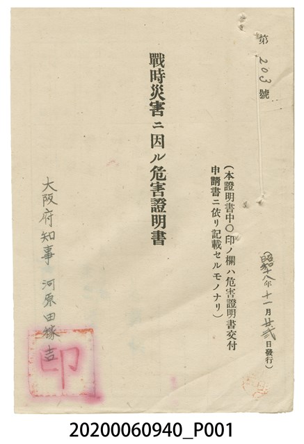 戰時造成的意外災害證明書第203號(昭和18年11月22日發行)