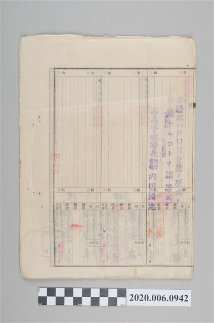 本件長19公分、寬26公分、高0.1公分。為戰時造成之意外災害證明書,資料以棉繩綁起,為昭和18年(1943)11月22日發行,經手人事為大阪府知事河原田稼吉,後方附上文件為個案證明書,包含受害者之籍貫、住所、危害狀況、給付金等相關資料。