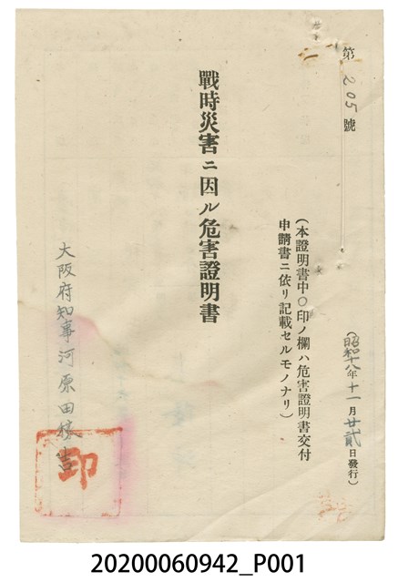 戰時造成的意外災害證明書第205號(昭和18年11月22日發行)