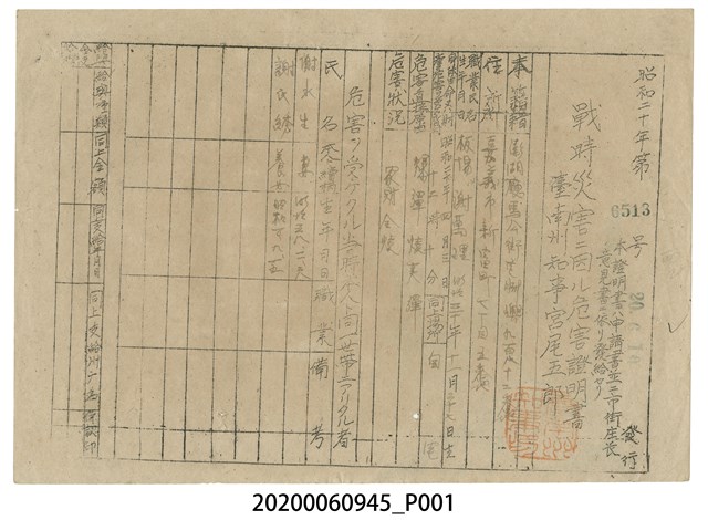 戰時造成的意外災害證明書第6513號(昭和20年6月10日發行)