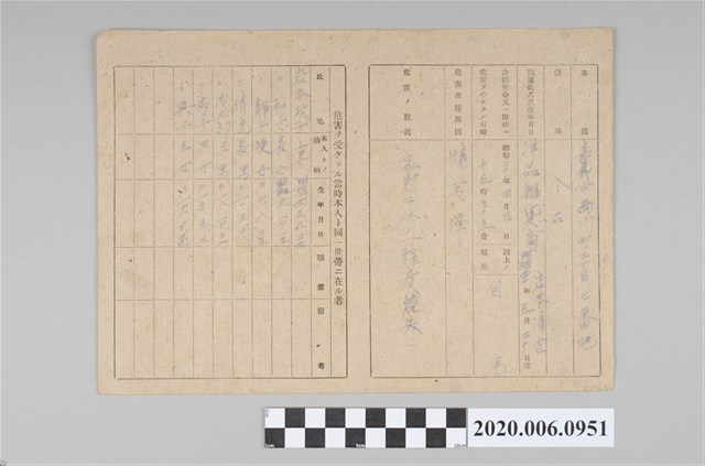 本件長19公分、寬26公分、高0.1公分。為戰時造成之意外災害證明書,為昭和20年(1945)5月30日發行,經手人為臺南州知事宮尾五郎,後方附上文件為個案證明書,包含受害者之籍貫、住所、危害狀況、給付金等相關資料。