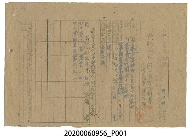 戰時造成的意外災害證明書第8481號(昭和20年5月30日發行)