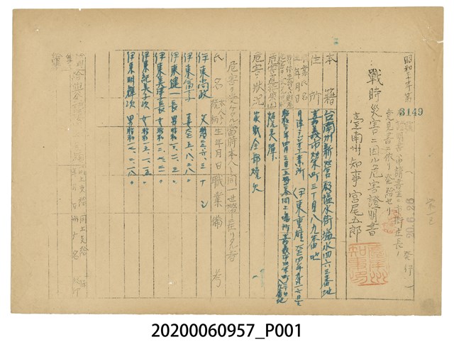 本件長19公分、寬26公分、高0.1公分。為戰時造成之意外災害證明書,為昭和20年(1945)6月26日發行,經手人為臺南州知事宮尾五郎,後方附上文件為個案證明書,包含受害者之籍貫、住所、危害狀況、給付金等相關資料。