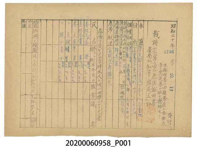戰時造成的意外災害證明書第4736號(昭和20年7月12日發行)