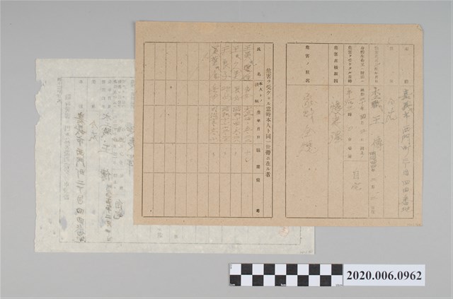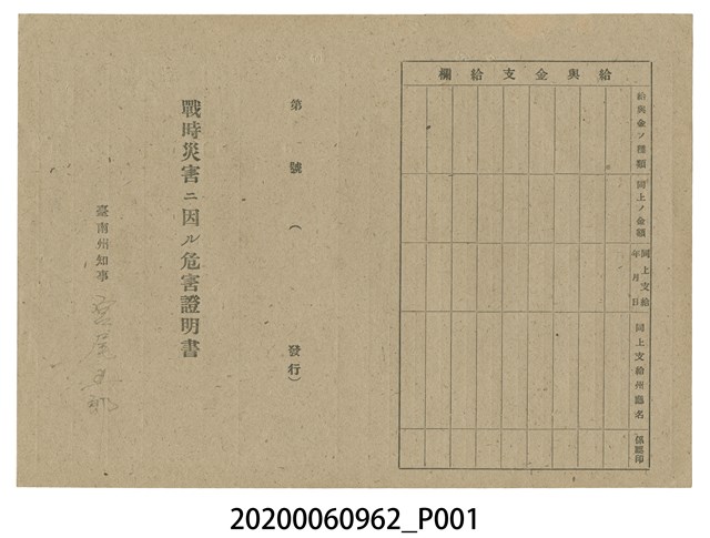 本件長19公分、寬26公分、高0.1公分。為戰時造成之意外災害證明書,為昭和20年(1945)5月1日發行,經手人為臺南州知事宮尾五郎,後方附上文件為個案王傳及家族之證明書,包含受害者之籍貫、住所、危害狀況、給付金等相關資料。