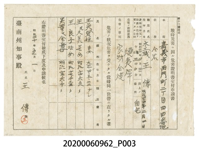 1945年5月1日王傳家族之戰時造成的意外災害證明書與交付申請書