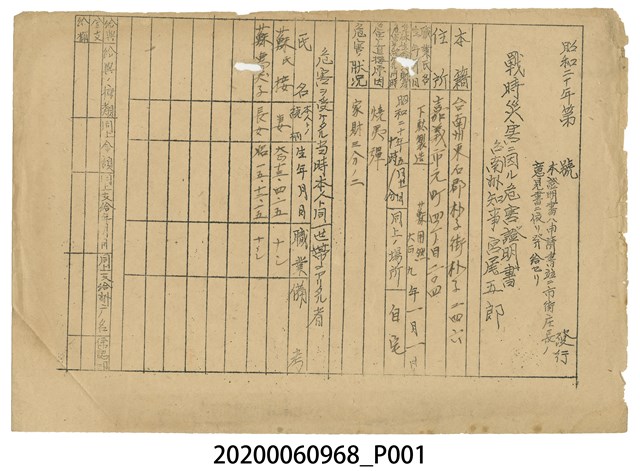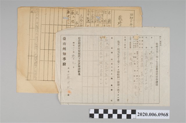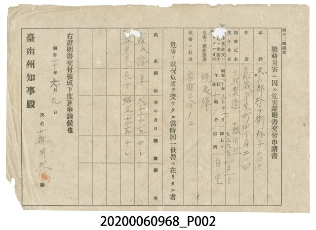 2020.006.0968 1945年6月9日蘇用然家族之戰時造成的意外災害證明書與交付申請書
