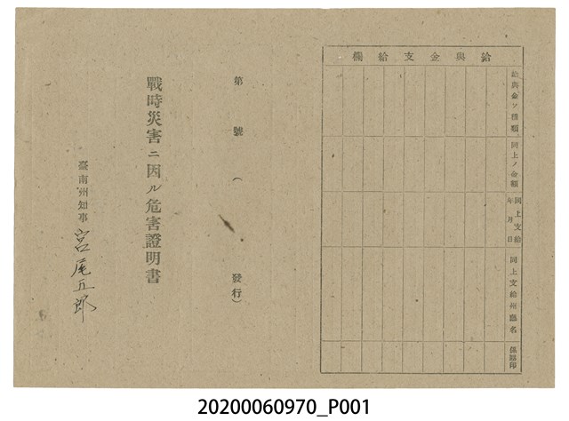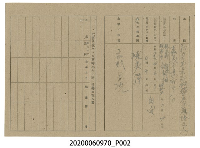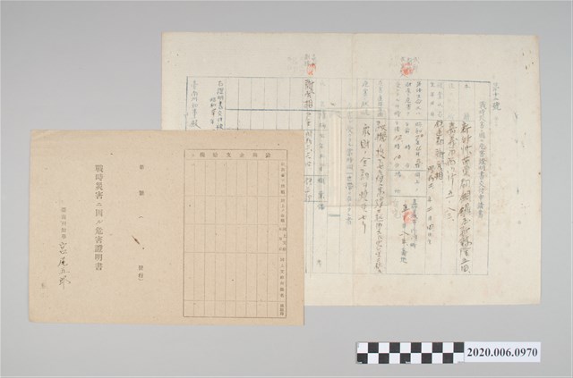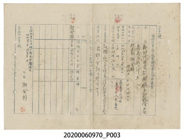 2020.006.0970 1945年4月20日謝發相之戰時造成的意外災害證明書與交付申請書
