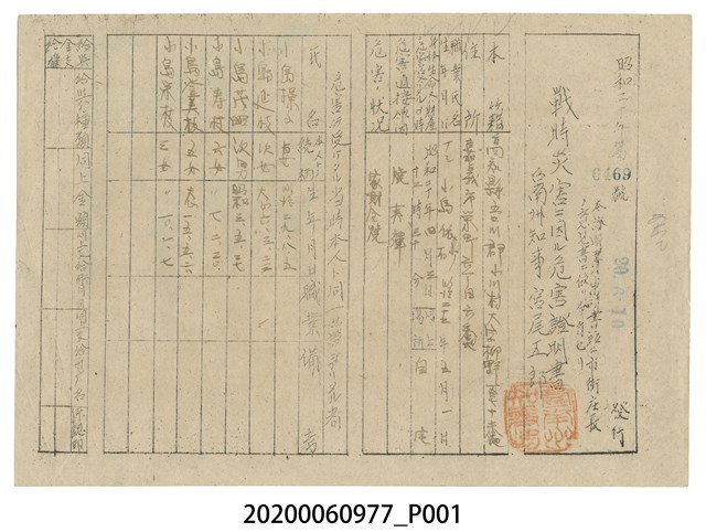 戰時造成的意外災害證明書第6469號(昭和20年6月10日發行)