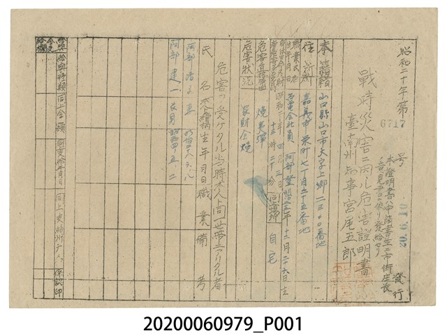 戰時造成的意外災害證明書第6717號(昭和20年6月10日發行)