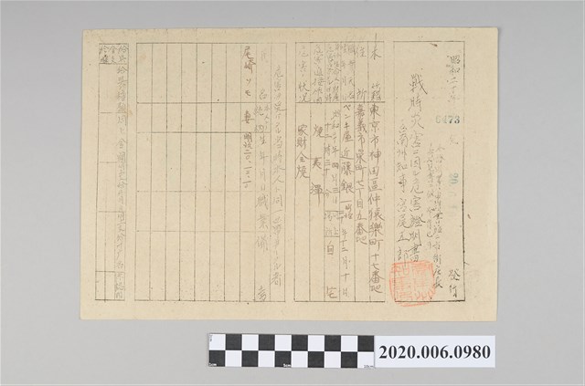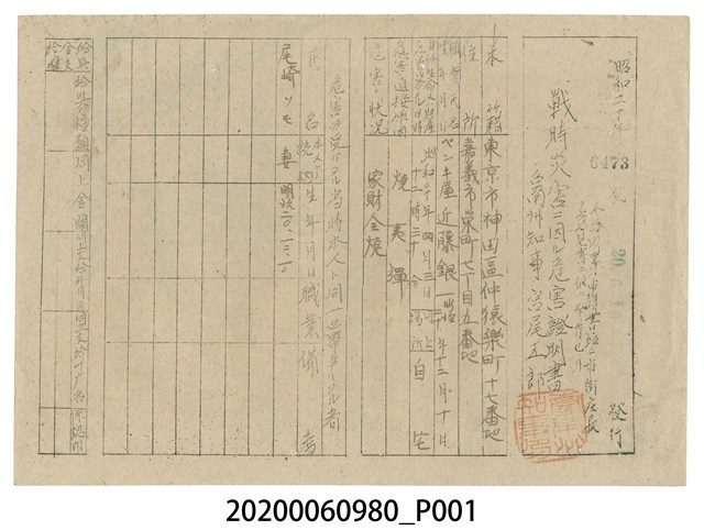 2020.006.0980 戰時造成的意外災害證明書第6473號(昭和20年6月10日發行)
