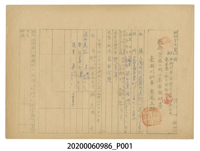 本件長19公分、寬26公分、高0.1公分。為戰時造成之意外災害證明書,為昭和20年(1945)6月1日發行,經手人為臺南州知事宮尾五郎,後方附上文件為個案證明書,包含受害者之籍貫、住所、危害狀況、給付金等相關資料。