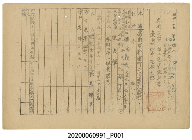 2020.006.0991 戰時造成的意外災害證明書第4396號(昭和20年5月20日發行)