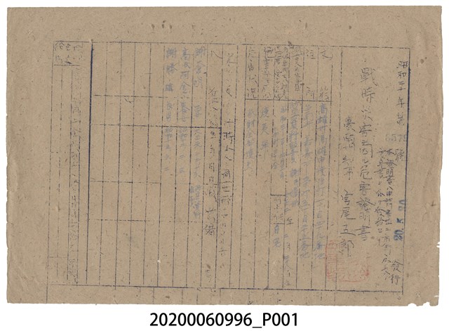 2020.006.0996 戰時造成的意外災害證明書第8579號(昭和20年5月30日發行)