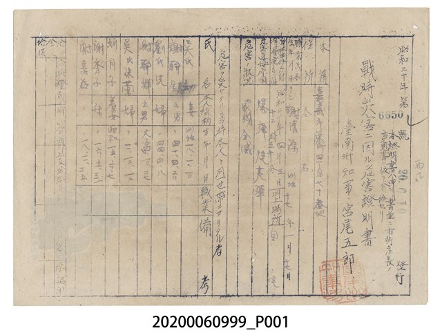 本件長19公分、寬26公分、高0.1公分。為戰時造成之意外災害證明書,為昭和20年(1945)6月10日發行,經手人為臺南州知事宮尾五郎,後方附上文件為個案證明書,包含受害者之籍貫、住所、危害狀況、給付金等相關資料。