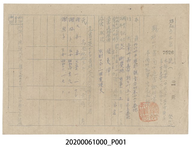 2020.006.1000 戰時造成的意外災害證明書第7526號(昭和20年6月10日發行)