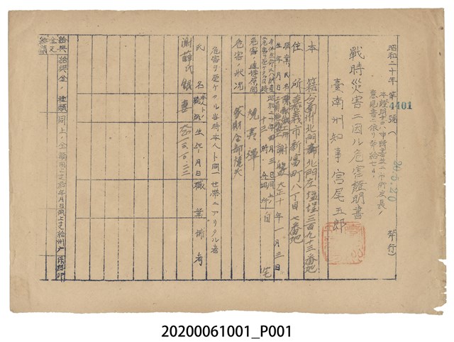2020.006.1001 戰時造成的意外災害證明書第4401號(昭和20年5月20日發行)