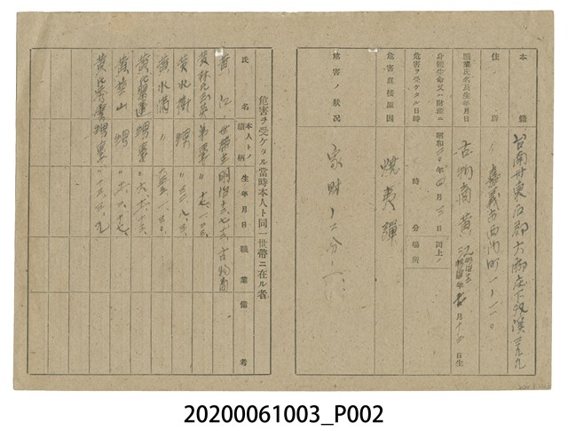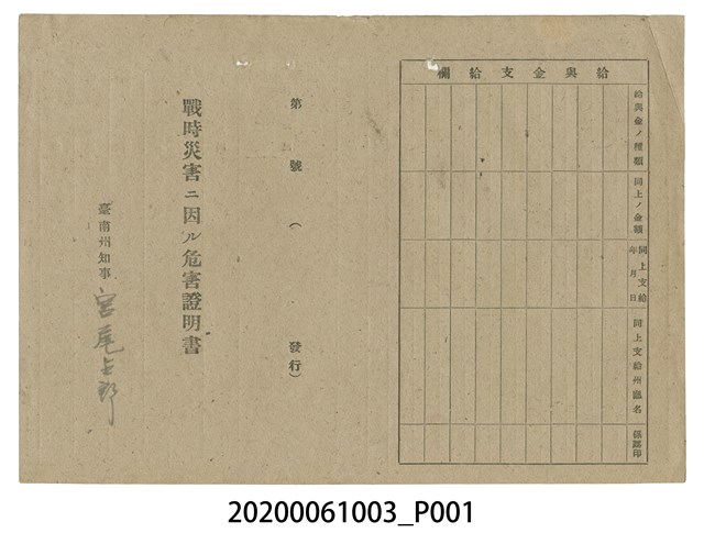 本件長19公分、寬26公分、高0.1公分。為戰時造成之意外災害證明書,為昭和20年(1945)9月10日發行,經手人為臺南州知事宮尾五郎,後方附上文件為個案黃江家族之證明書,包含受害者之籍貫、住所、危害狀況、給付金等相關資料。
