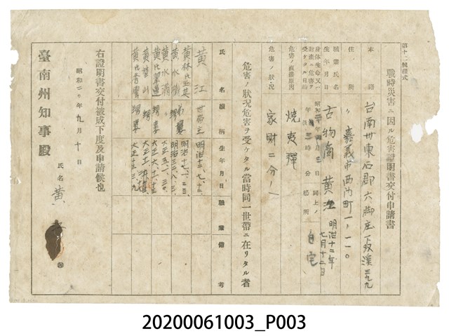 1945年9月10日黃江家族之戰時造成的意外災害證明書與交付申請書