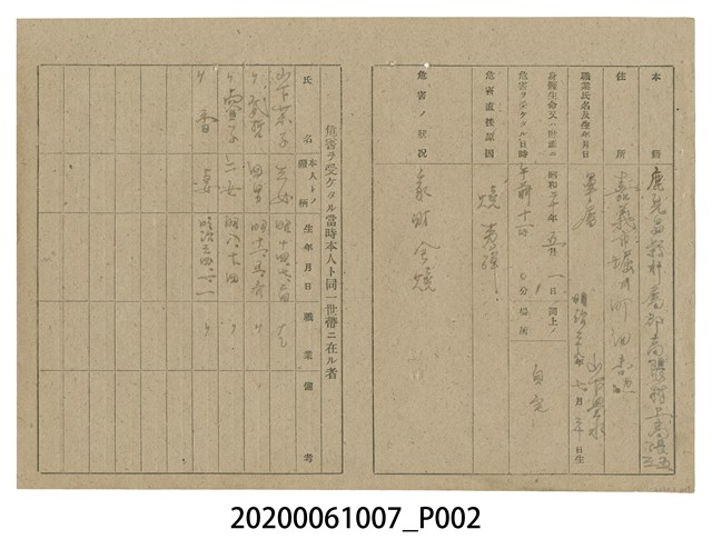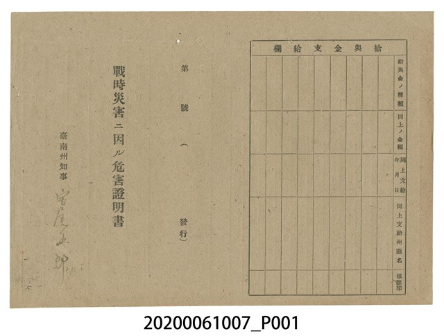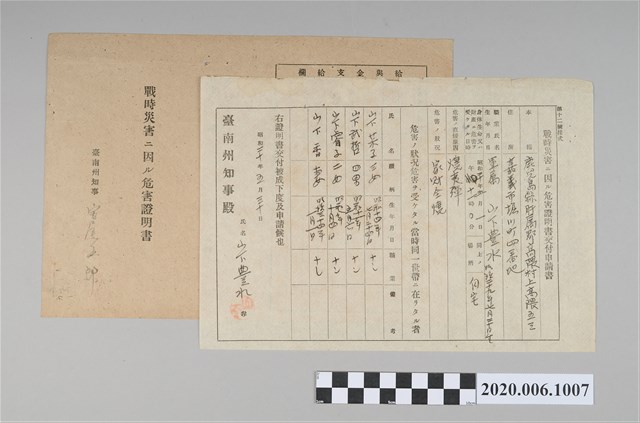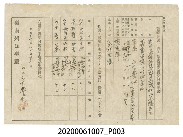 2020.006.1007 1945年5月30日山下豊水家族之戰時造成的意外災害證明書與交付申請書