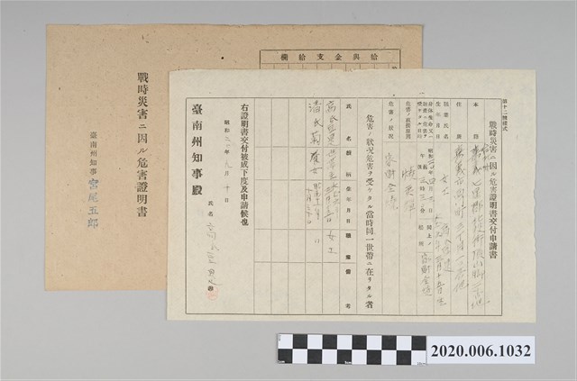 2020.006.1032 1945年9月10日高氏豆是家族之戰時造成的意外災害證明書與交付申請書