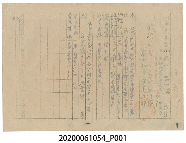 本件長19公分、寬26公分、高0.1公分。為戰時造成之意外災害證明書,為昭和20年(1945)6月10日發行,經手人為臺南州知事宮尾五郎,後方附上文件為個案證明書,包含受害者之籍貫、住所、危害狀況、給付金等相關資料。