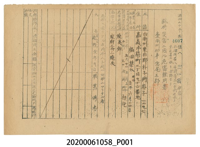 2020.006.1058 戰時造成的意外災害證明書第4607號(昭和20年7月12日發行)