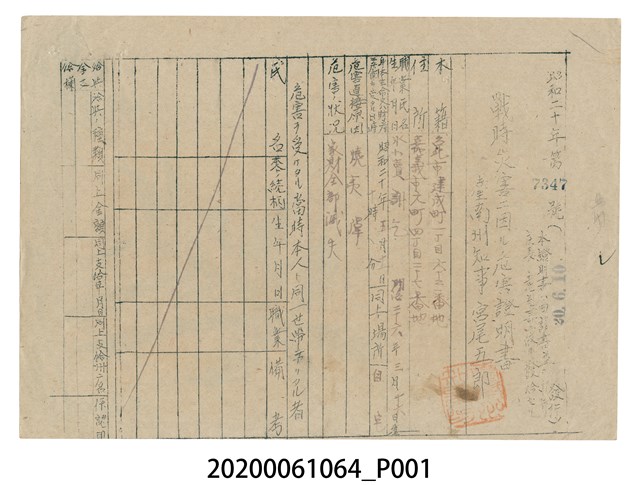 戰時造成的意外災害證明書第7347號(昭和20年6月10日發行)