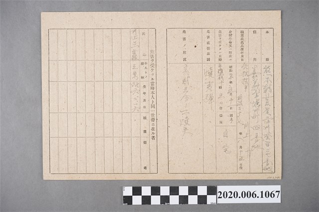 2020.006.1067 1945年6月1日川上力家族之戰時造成的意外災害證明書與交付申請書