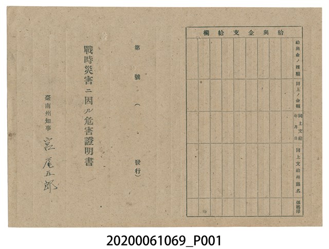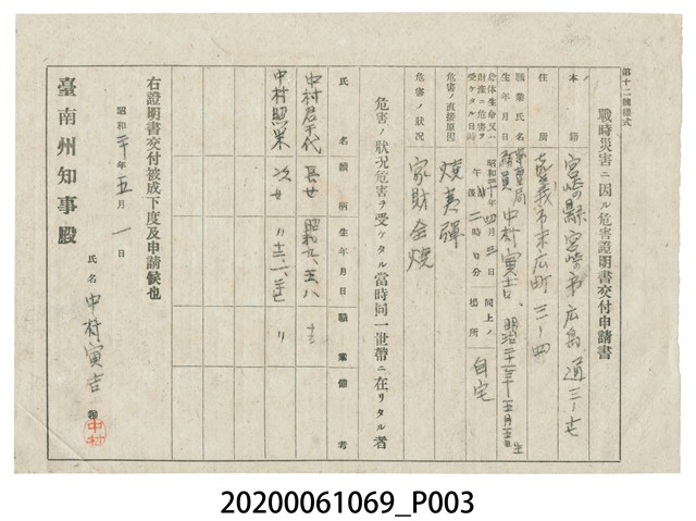 戰時災害證明書、臺南州