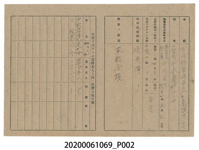 1945年5月1日中村寅吉家族之戰時造成的意外災害證明書與交付申請書