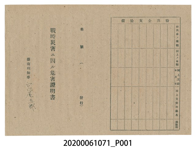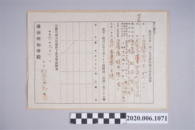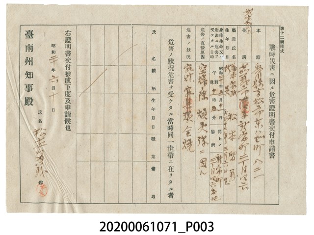 本件長19公分、寬26公分、高0.1公分。為戰時造成之意外災害證明書,為昭和20年(1945)6月10日發行,經手人為臺南州知事宮尾五郎,後方附上文件為個案證明書,包含受害者之籍貫、住所、危害狀況、給付金等相關資料。