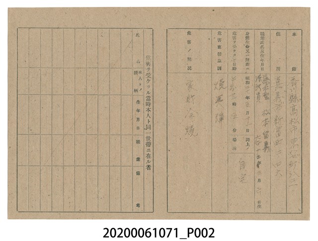 1945年6月10日松本留義之戰時造成的意外災害證明書與交付申請書