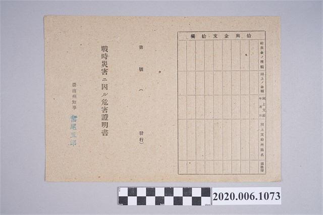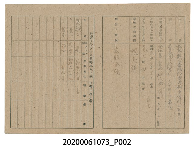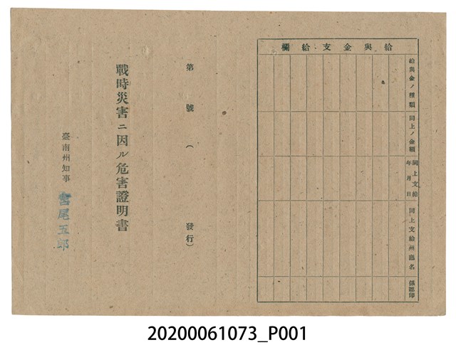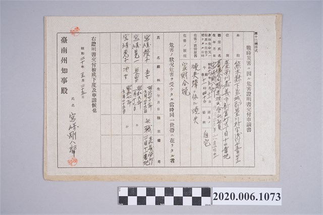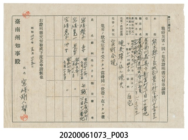 2020.006.1073 1945年5月25日宮崎剛八郎家族之戰時造成的意外災害證明書與交付申請書