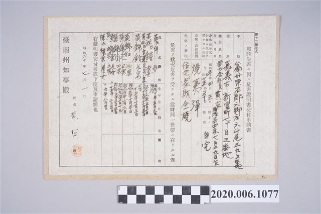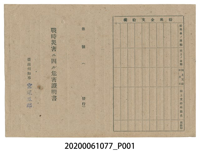 本件長19公分、寬26公分、高0.1公分。為戰時造成之意外災害證明書,為昭和20年(1945)7月1日發行,經手人為臺南州知事宮尾五郎,後方附上文件為個案證明書,包含受害者之籍貫、住所、危害狀況、給付金等相關資料。
