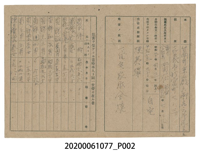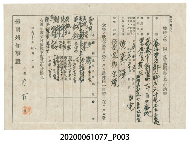 1945年7月1日黄在家族之戰時造成的意外災害證明書與交付申請書