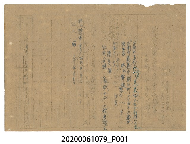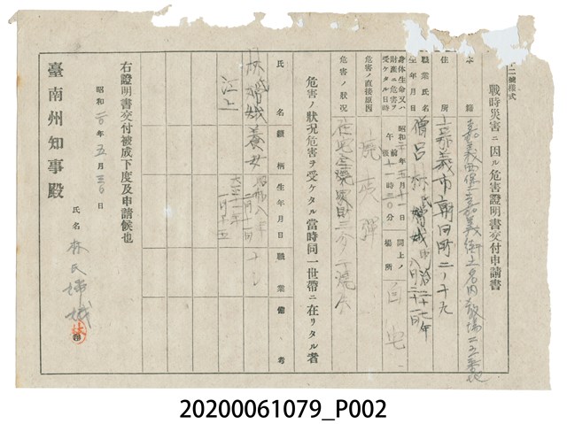 本件長19公分、寬26公分、高0.1公分。為戰時造成之意外災害證明書,為昭和20年(1945)5月30日發行,經手人為臺南州知事宮尾五郎,後方附上文件為個案證明書,包含受害者之籍貫、住所、危害狀況、給付金等相關資料。