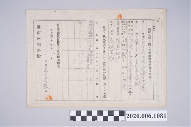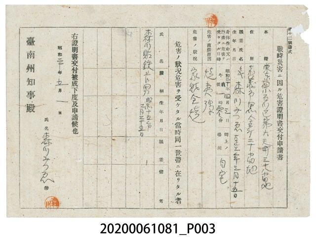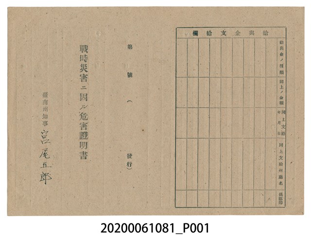 本件長19公分、寬26公分、高0.1公分。為戰時造成之意外災害證明書,為昭和20年(1945)5月31日發行,經手人為臺南州知事宮尾五郎,後方附上文件為個案證明書,包含受害者之籍貫、住所、危害狀況、給付金等相關資料。