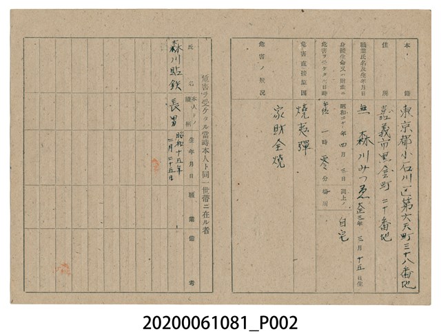 1945年5月31日森川みつゑ家族之戰時造成的意外災害證明書與交付申請書