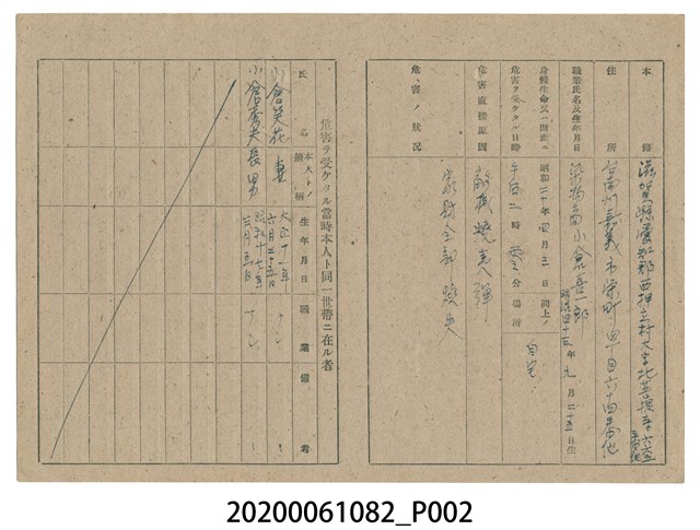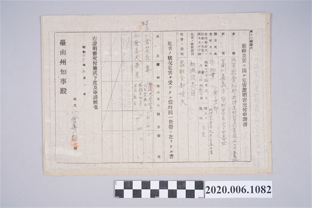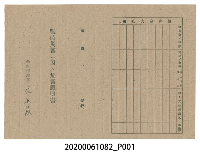 本件長19公分、寬26公分、高0.1公分。為戰時造成之意外災害證明書,為昭和20年(1945)5月1日發行,經手人為臺南州知事宮尾五郎,後方附上文件為個案證明書,包含受害者之籍貫、住所、危害狀況、給付金等相關資料。